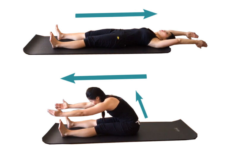 - Reverse the action by slowly rolling up into a sitting posture (with arms straight!).